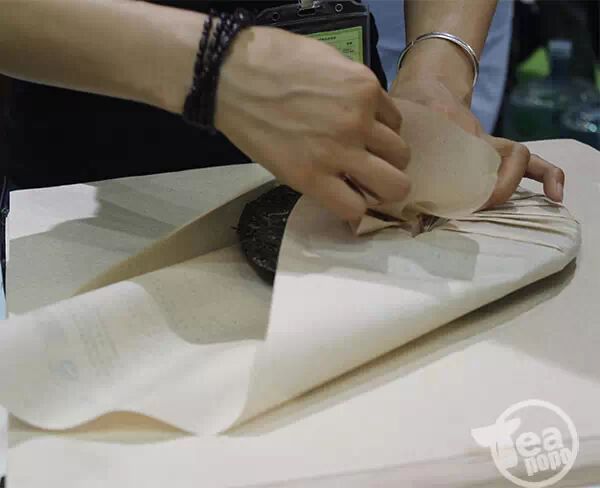 包装时要将带有内飞一面作为茶饼的背面,背面装纸旋转折叠后,剩一个边角,将其他将其折起来的纸塞进制团时留出来的小洞上,最后用边角将小洞上的折纸团封好。