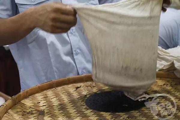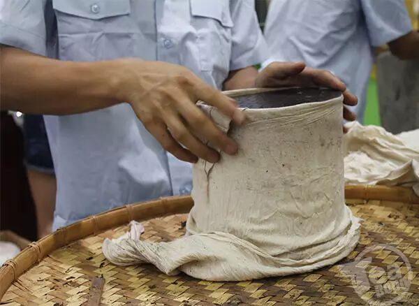 将软的毛茶放进布裹里,放进内飞,加夹在两块圆形的铁块中间,用力将其揉成椭圆状。这里有个小细节,就是用竹筷将茶团其中一面戳个小洞,以便后期包装。