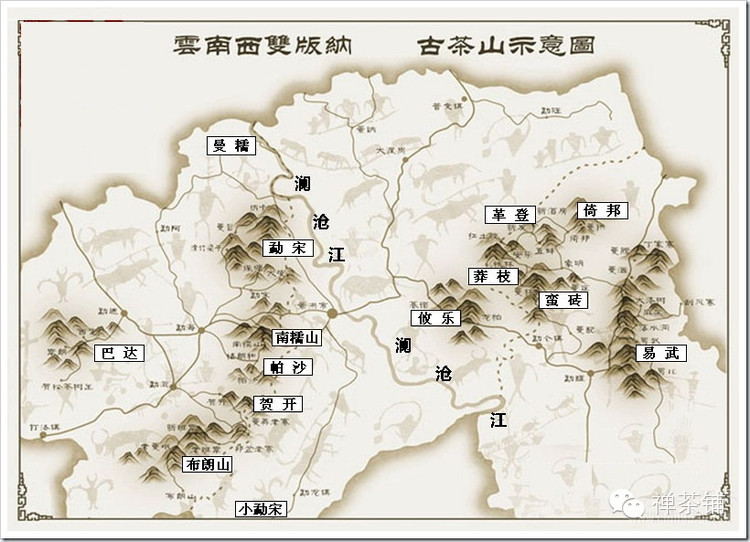 普洱古茶山以澜沧江为界划分为江内六座:革登、莽枝、倚邦、蛮砖、易武(曼撒)、攸乐;江外六座:南糯、布朗、巴达、南峤、勐宋、景迈。由于各茶山的茶树生长环境各异,土壤所含化学成分也不一样,因而这十二座茶山所产的茶叶在口感上各有不同。